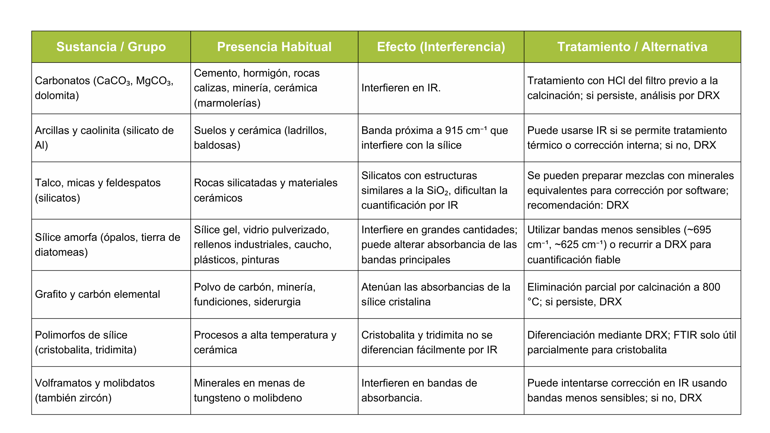 Se considera interferencia a cualquier sustancia en la muestra que modifique la respuesta espectral de la sílice cristalina, afectando a su cuantificación exacta.
